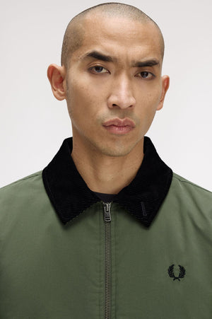 A hip-length Caban jacket with a corduroy collar. Regular fit, cotton and recycled polyester blend fabric With a branded puller, the metal zip Cuffs with a fake horn finish and button up The left chest has the Laurel Wreath logo embroidered on it.