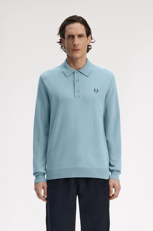 Cotton and RWS merino wool blend knit / Regular fit / Three button placket with high polish buttons / Ribbed trims / Laurel Wreath embroidered logo on the left hand chest