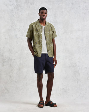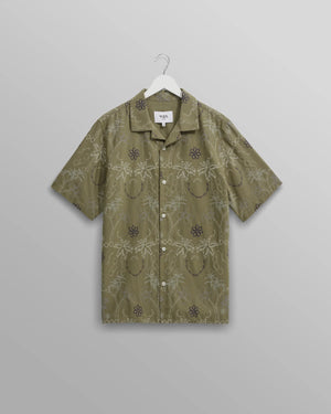 Wax's staple Didcot short-sleeve shirt makes a triumphant return for SS25. Cut for a relaxed, breezy fit, this khaki version is made from a cotton-linen blend and is adorned with a Hawaiian-inspired embroidery design