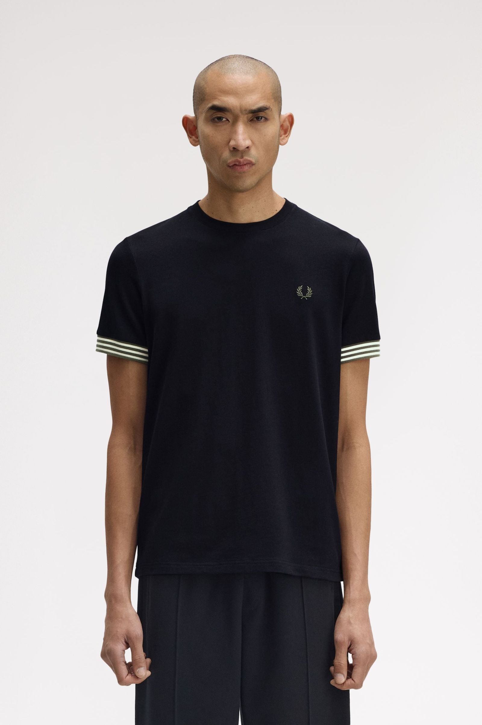 A smart cotton piqué t-shirt with stripe detail to the cuffs. Lightweight cotton piqué fabric / Classic fit / Ribbed crew neck / Yarn dyed stripe cuff design / Laurel Wreath embroidered logo on the left hand chest