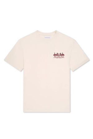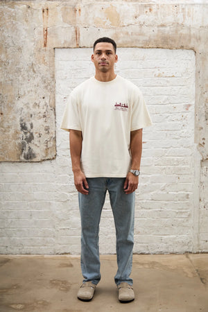 Crafted from 240 GSM 100% piece dyed cotton jersey. This oversized short sleeve crew neck t-shirt in off white, features a graphic on the back and a smaller hit on the front chest