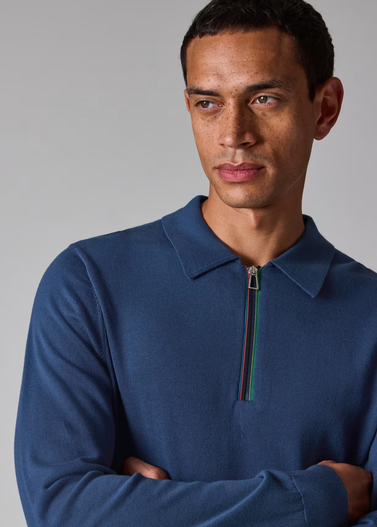Made from 100% organic cotton this mid-blue long-sleeve polo features a half zip closure with vibrant 'Sports Stripe' detail. Cut for a regular-fit, this polo is finished with ribbed cuffs and waistband and offers an easy alternative to shirting..