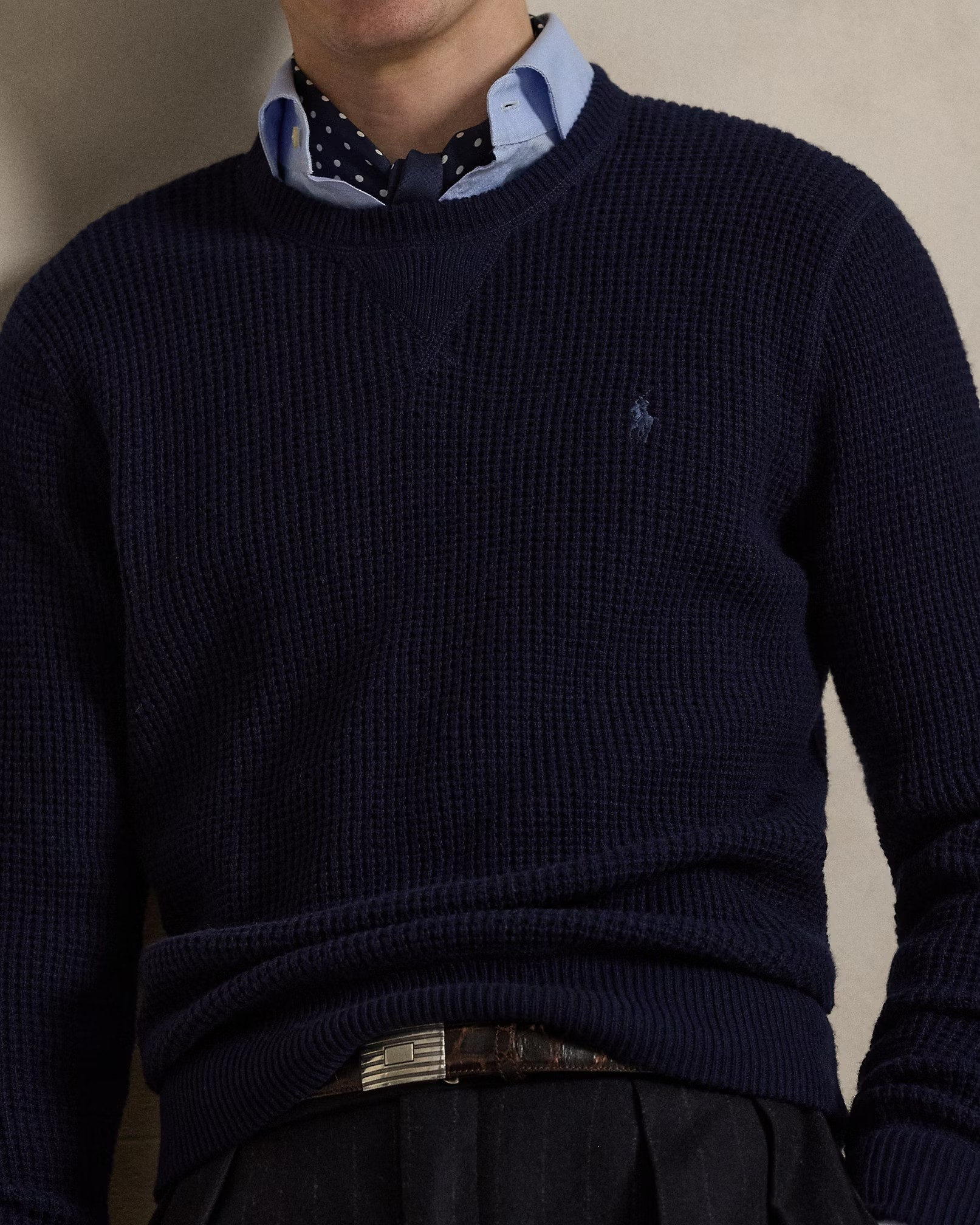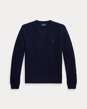 With a silhouette inspired by athletic crewnecks, this jumper unites soft wool-and-cotton yarn with a waffle-knit technique to create a plush texture. It is intricately embroidered with the iconic Polo Pony on the left chest.