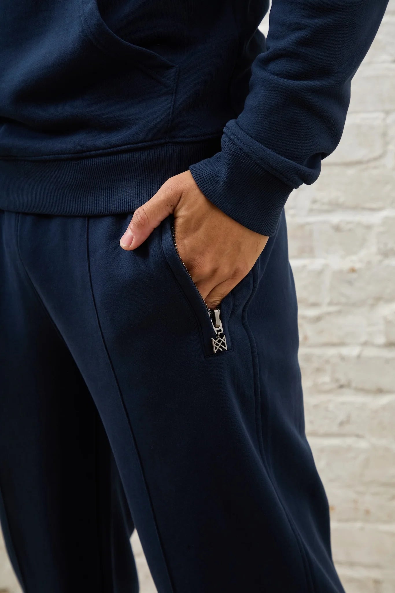 Crafted with precision and an eye for cultural style, the Prince Split-Hem Sweatpants in Navy are made from 355 GSM Portuguese milled diagonal cotton jersey fleece. This luxurious fabric ensures optimal comfort, durability, and a smooth fee